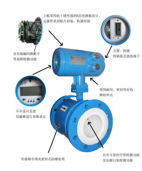 在測量導管的內側及法蘭密封面上,有一層完整的電絕緣襯里。它直接接觸被測液體,其作用是增加測量導管的耐腐蝕性,防止感應電勢被金屬測量導管管壁短路。襯里材料多為耐腐蝕、耐高溫、耐磨的聚四氟乙烯塑料、陶瓷等。