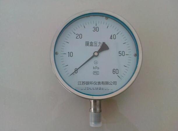 不銹鋼膜盒壓力表參照原膜盒壓力表的結構特點而研制的具有耐腐蝕作用的微壓表。應用于鍋爐通風和氣體管道等設備上,在耐腐要求較高的工藝流程中測量各種氣體介質的微壓和負壓。準確度等級:2.5