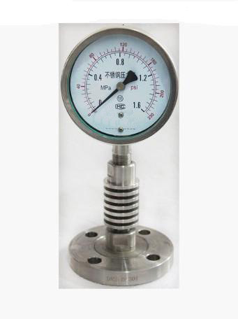 耐高溫隔膜壓力表在耐溫壓力表的基礎上加裝不銹鋼隔離散熱器,內充隔離液體,測量的介質溫度可達≤450℃。主要測量高溫高壓的蒸汽壓力,適用于石油開采和熱點行業。