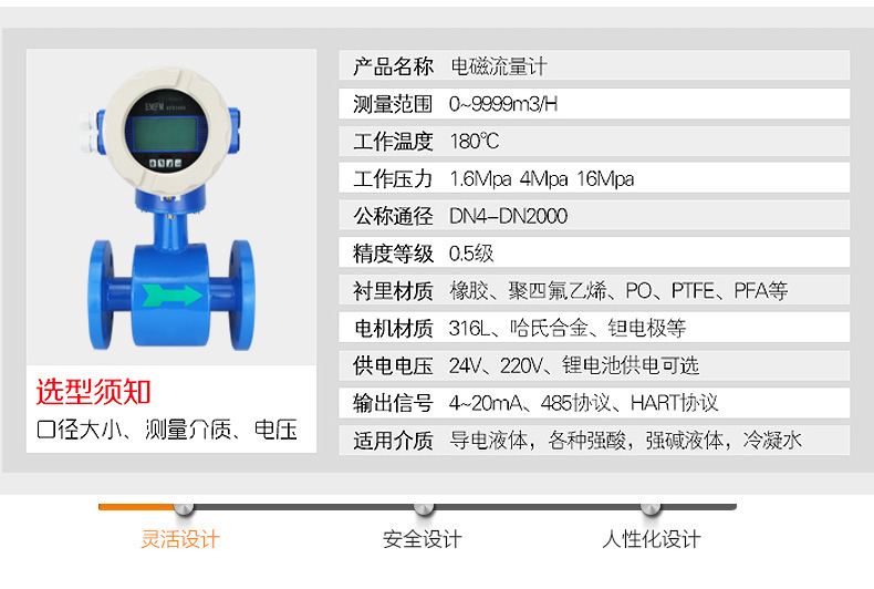 流過垂直于流動方向的磁場,導電性液體的流動感應出一個與平均流速成正比的電壓,其感應電壓信號通過二個或二個以上與液體直接接觸的電極檢出,并通過電纜送至轉換器通過智能化處理,然后LCD顯示或轉換成標準信號4~20mA和0~1kHz輸出。