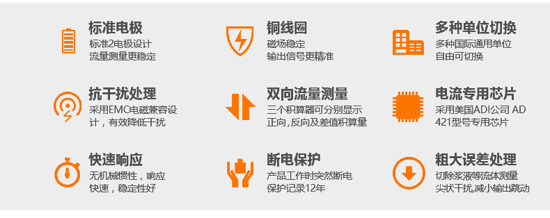 特別設計了帶背光寬溫的中文液晶顯示器,功能齊全實用、顯示直觀、操作使用方便,可以減少其他電磁流量計英文菜單所帶來的不便。另外我們設計4-6多電極結構,進一步保證了測量精度并且任何時候無需接地環,減輕了儀表體積和安裝維護的麻煩。