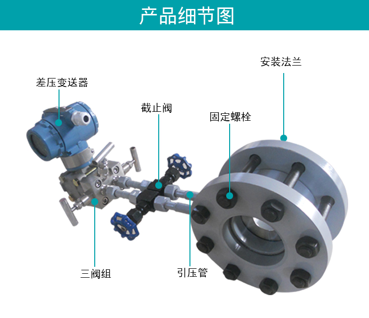 節流件:標準孔板、標準噴嘴、長徑噴嘴、1/4圓孔板、雙重孔板、偏心孔板、圓缺孔板、錐形入口孔板等 取壓裝置:環室、取壓法蘭、夾持環、導壓管等 連接法蘭(國家標準、各種標準及其它設計部門的法蘭) 、緊固件。 測量管。