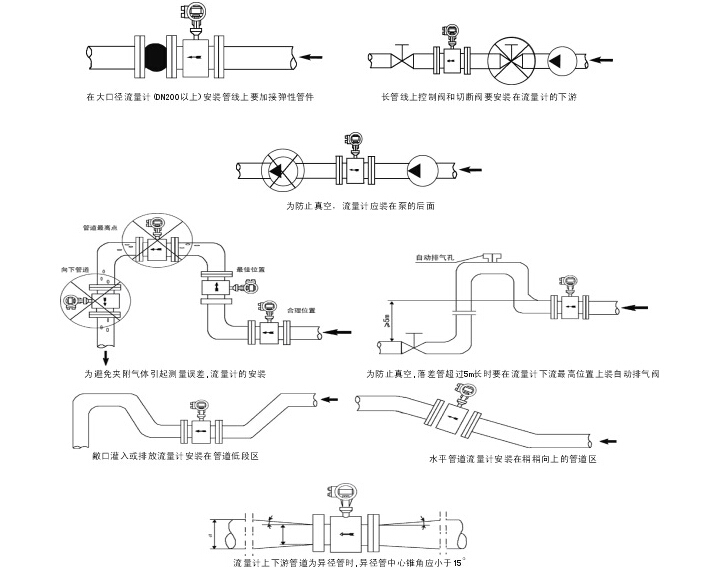 二、改變管道流向。電磁流量計不僅可以用在水平管道上,也可以用在垂直管道上,安裝在液體由下向上流動的地方就可以。如果現場條件允許,我們不妨改造一下管道,加幾個彎頭,把管道做成“幾”字型,然后將流量計安裝在垂直管道上液體向上流動的地方,這樣,這個管道內的液體會一直處于滿管狀態,只是流動速度會有變化而已。