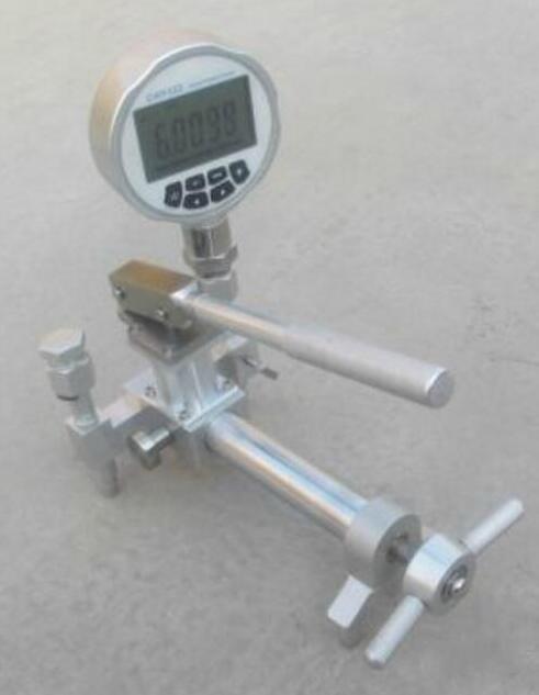 將微調調至適當位置(中間位置),關閉油杯上方截止閥。輕輕操作杠桿,使變壓器油至兩個壓力輸出接口。再安裝標準表和被檢表,操作杠桿升壓至65MPa左右時,使用微調調至60MPa,穩定2-3分鐘后,逐點檢測。(過壓保護閥在造壓前一直打開)