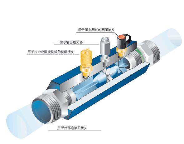 渦輪的轉(zhuǎn)速通過(guò)裝在機(jī)殼外的傳感線圈來(lái)檢測(cè)。當(dāng)渦輪葉片切割由殼體內(nèi)較久磁鋼產(chǎn)生的磁力線時(shí),就會(huì)引起傳感線圈中的磁通變化。傳感線圈將檢測(cè)到的磁通周期變化信號(hào)送入前置放大器,對(duì)信號(hào)進(jìn)行放大、整形,產(chǎn)生與流速成正比的脈沖信號(hào),送入單位換算與流量積算電路得到并顯示累積流量值;同時(shí)亦將脈沖信號(hào)送入頻率電流轉(zhuǎn)換電路,將脈沖信號(hào)轉(zhuǎn)換成模擬電流量,進(jìn)而指示瞬時(shí)流量值。